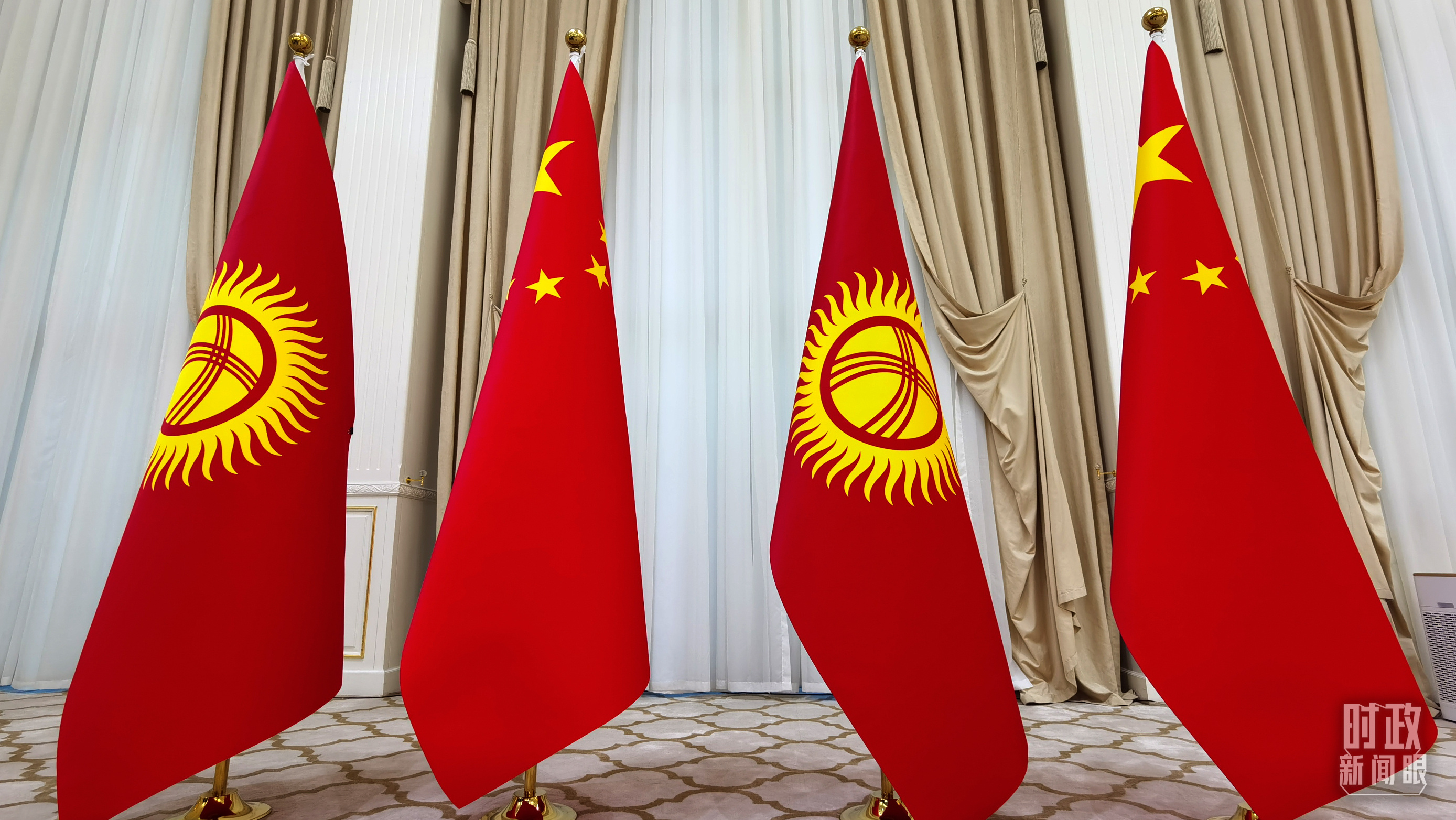 △中國(guó)、吉爾吉斯斯坦兩國(guó)元首會(huì)見(jiàn)現(xiàn)場(chǎng)擺放的國(guó)旗。(總臺(tái)央視記者曹亞星拍攝)