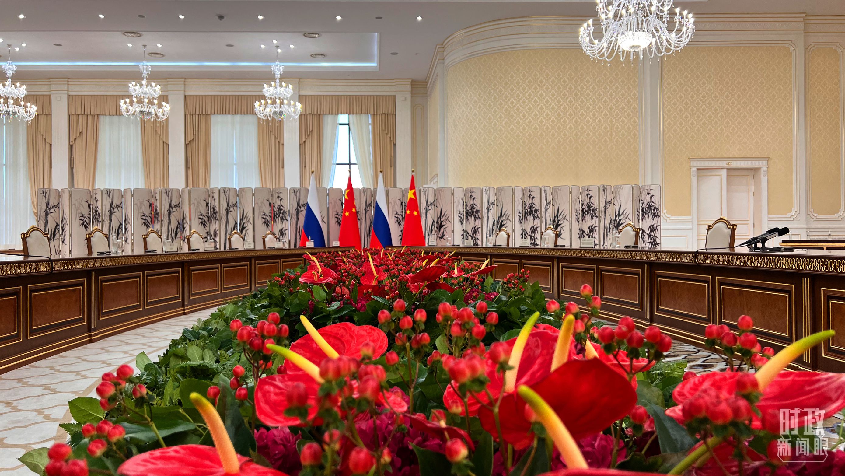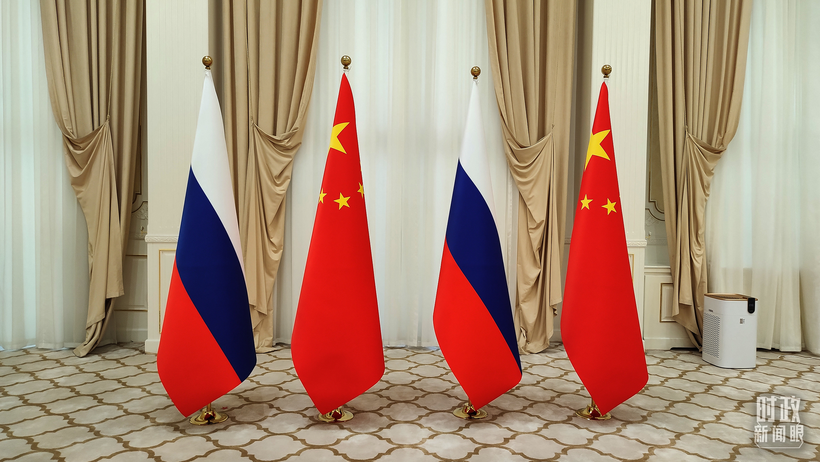 △中俄兩國(guó)元首會(huì)見(jiàn)現(xiàn)場(chǎng)擺放的兩國(guó)國(guó)旗。(總臺(tái)央視記者薛冠南拍攝)