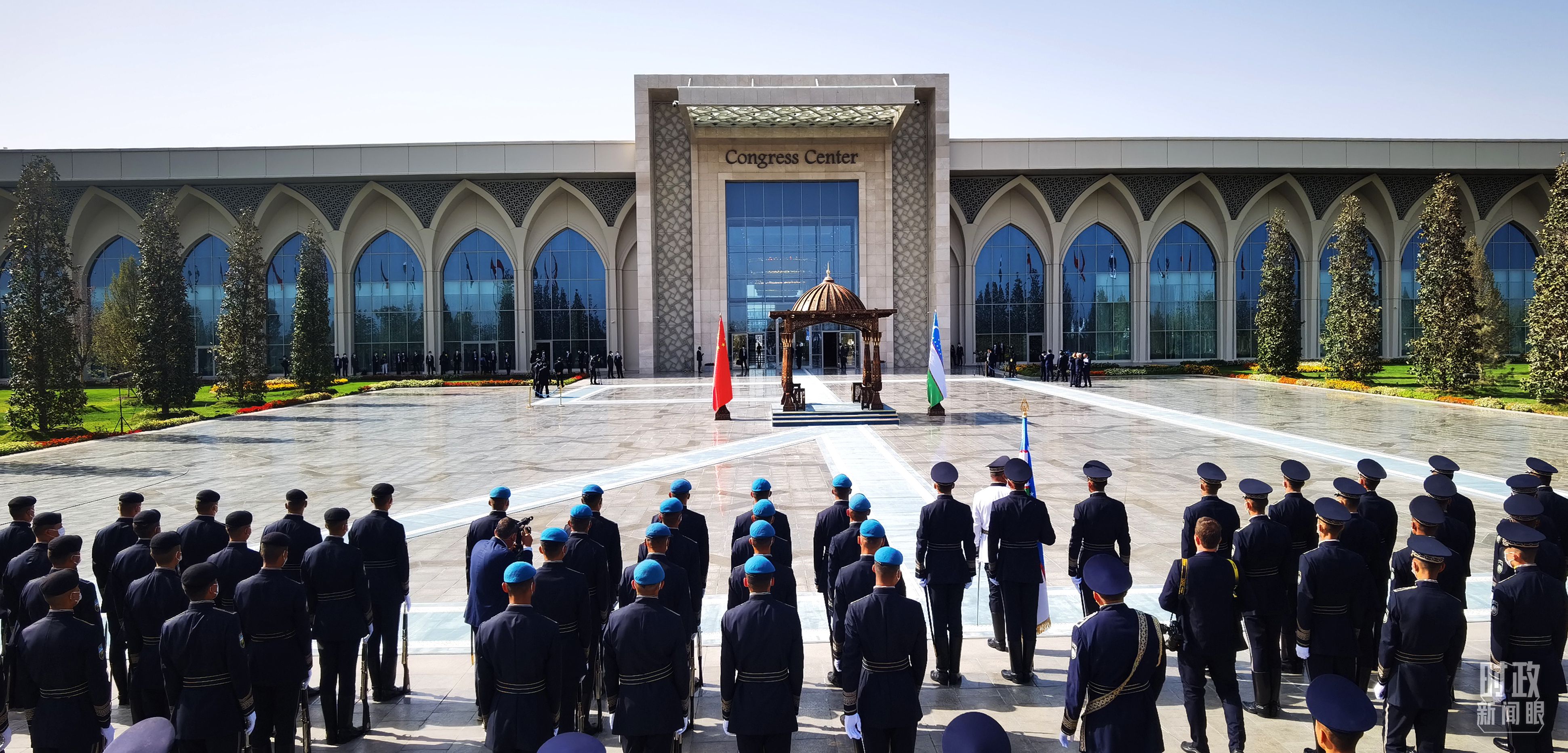 在國(guó)際會(huì)議中心的北門(mén)外廣場(chǎng),米爾濟(jì)約耶夫總統(tǒng)為習(xí)主席舉行了隆重的歡迎儀式。