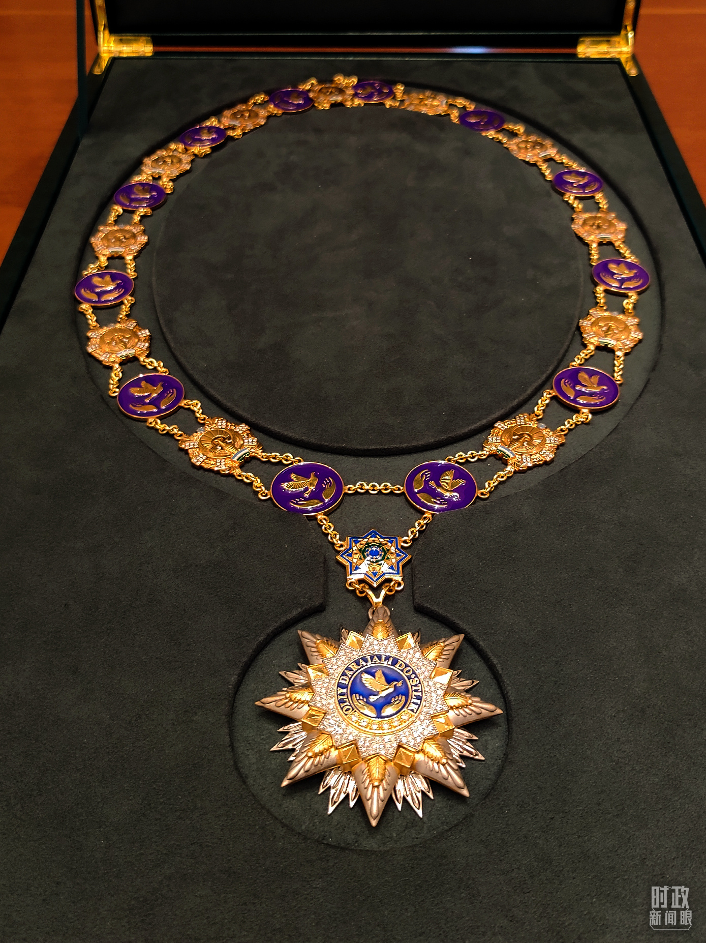 △“最高友誼”勛章章體分為4層,正中間是兩只手托舉和平鴿的圖案,象征友誼與和平,圖案外圍有烏茲別克語(yǔ)的“最高友誼”字樣。(總臺(tái)央視記者薛冠南拍攝)