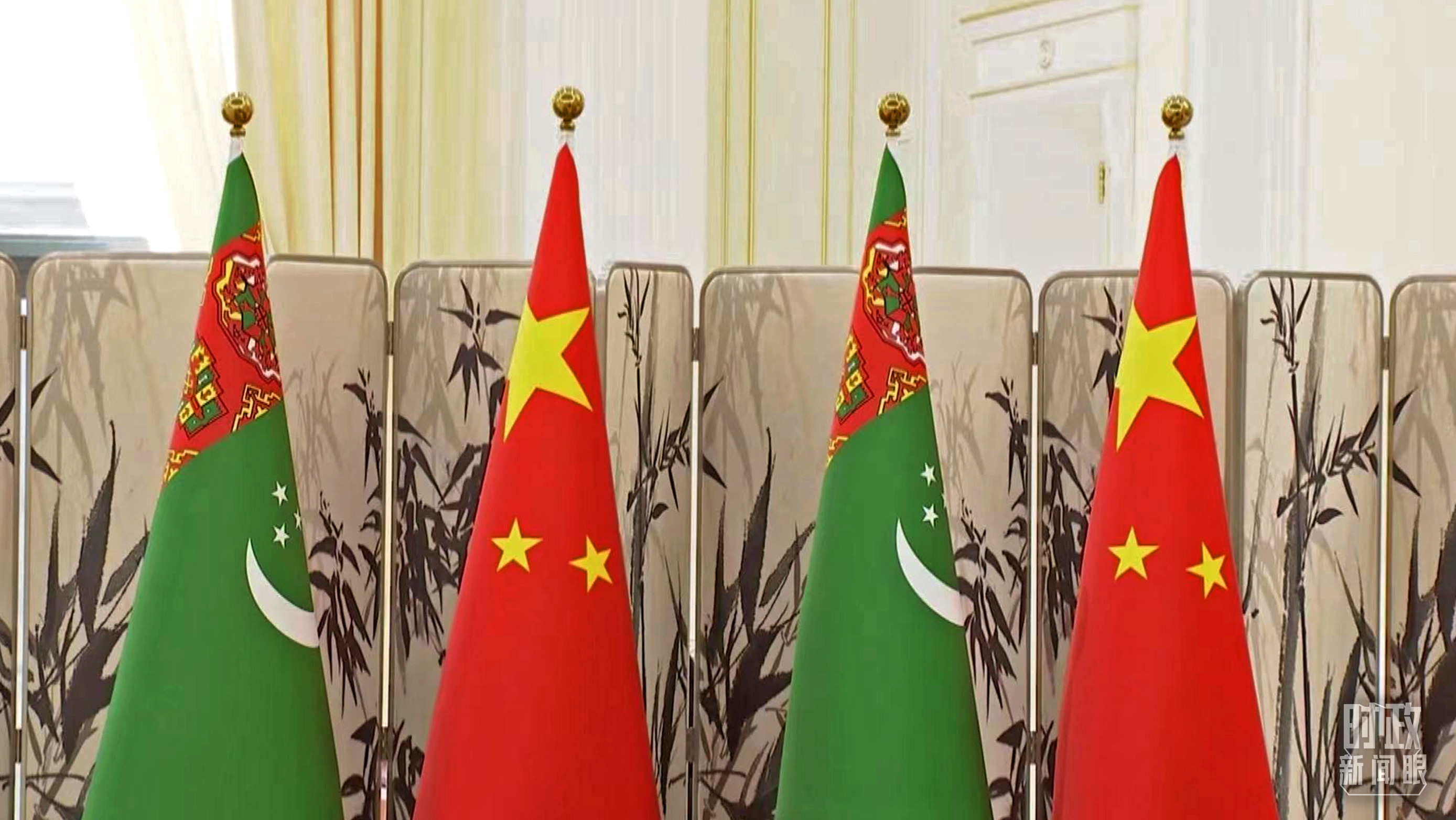 △中國(guó)、土庫(kù)曼斯坦兩國(guó)元首會(huì)見(jiàn)現(xiàn)場(chǎng)擺放的國(guó)旗。