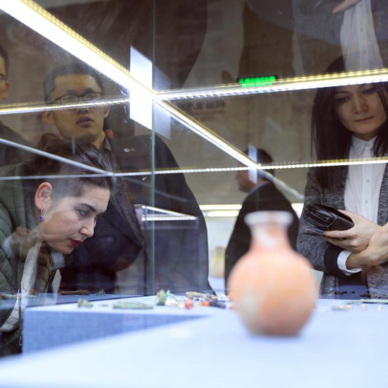 2019年2月22日,在烏茲別克斯坦塔什干國(guó)家歷史博物館,參觀者在中烏聯(lián)合考古成果展上觀看文物。陳列廳內(nèi)擺放了大小80件中烏聯(lián)合考古隊(duì)在撒馬爾罕市附近的薩扎干遺址和拜松市附近的拉巴特遺址發(fā)掘的文物,吸引眾多觀眾駐足觀看。新華社記者 蔡國(guó)棟 攝