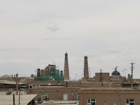 這是2019年4月23日在烏茲別克斯坦希瓦古城城墻上拍攝的遠(yuǎn)處的經(jīng)學(xué)院。新華社記者 蔡國(guó)棟 攝