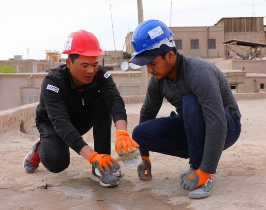 2019年4月22日,在烏茲別克斯坦希瓦古城哈!つ吕聨(kù)什別吉清真寺,中方文物修復(fù)人員正在指導(dǎo)烏方工作人員修復(fù)清真寺屋頂。新華社記者 蔡國(guó)棟 攝
