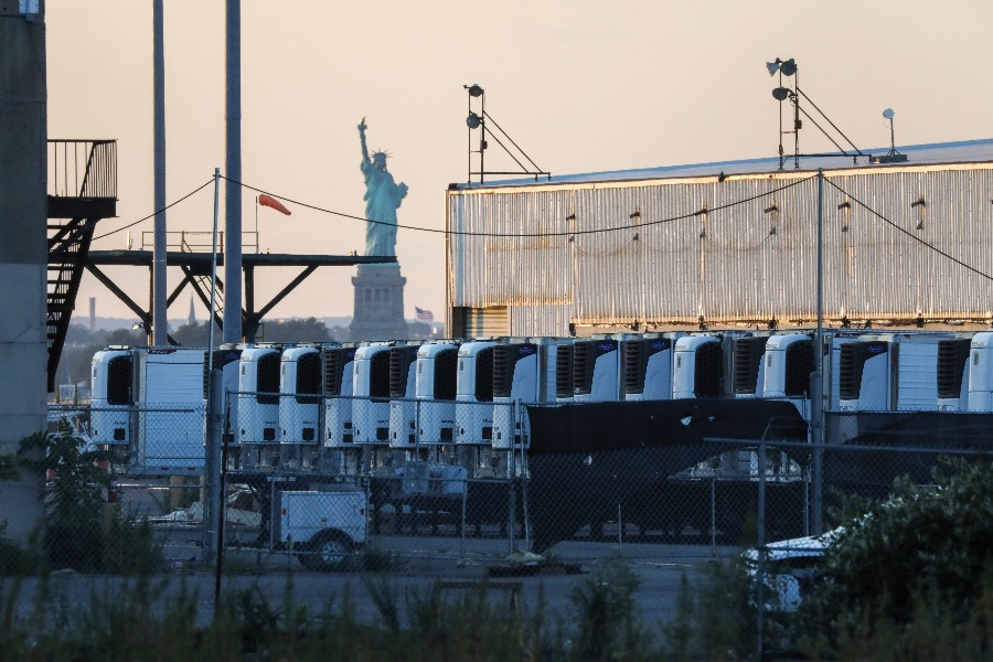 這是2021年9月6日在美國(guó)紐約布魯克林拍攝的一處臨時(shí)停尸場(chǎng)內(nèi)存放新冠患者遺體的冷藏車。新華社記者 王迎 攝