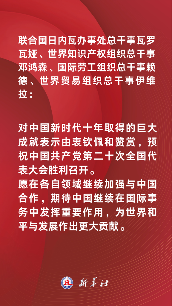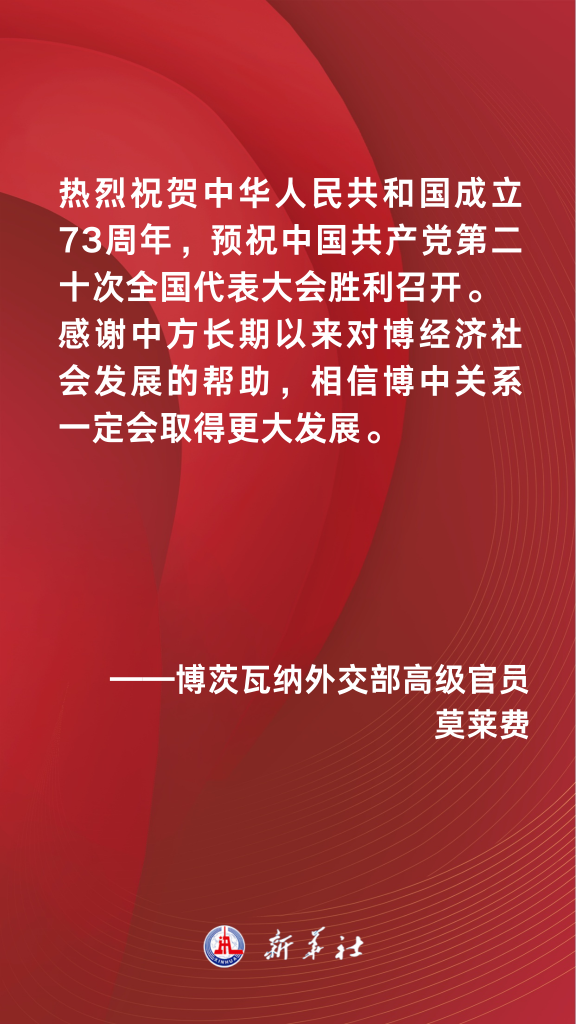 新華社北京10月2日電 我駐外使領(lǐng)館、使團(tuán)近日舉辦線下或云端國慶招待會等活動,慶祝中華人民共和國成立73周年,多個國際組織負(fù)責(zé)人、國家政要及各界人士出席活動或以其他方式發(fā)表致辭,對中華人民共和國成立73周年表示熱烈祝賀,預(yù)祝中國共產(chǎn)黨第二十次全國代表大會勝利召開,并期待與中國進(jìn)一步深化各領(lǐng)域友好合作。