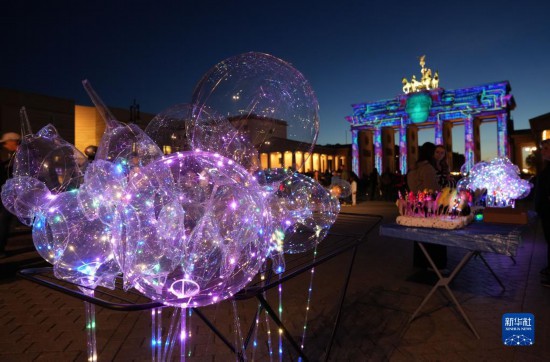 這是10月7日在德國柏林勃蘭登堡門前拍攝的用彩燈裝飾的氣球。新華社發(fā)(斯特凡·蔡茨攝)