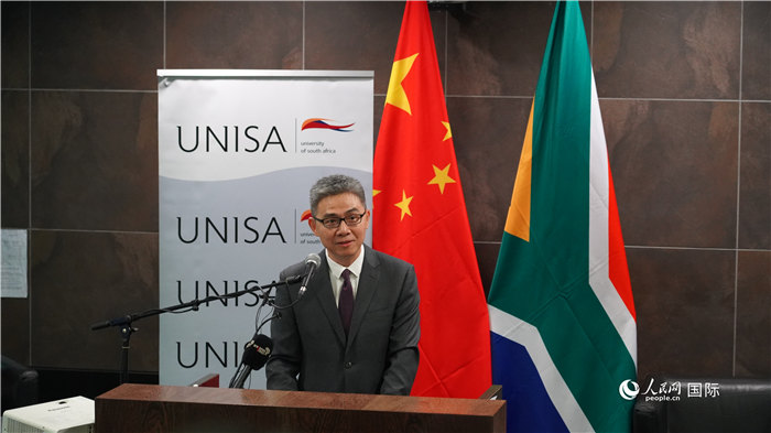 約翰內(nèi)斯堡大學(xué)非中研究中心主任孟大為發(fā)表致辭。人民網(wǎng) 張茜攝