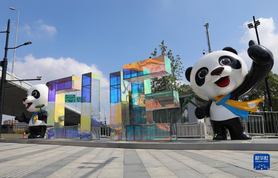 這是國(guó)家會(huì)展中心(上海)北入口外的進(jìn)博主題裝飾(10月15日攝)。