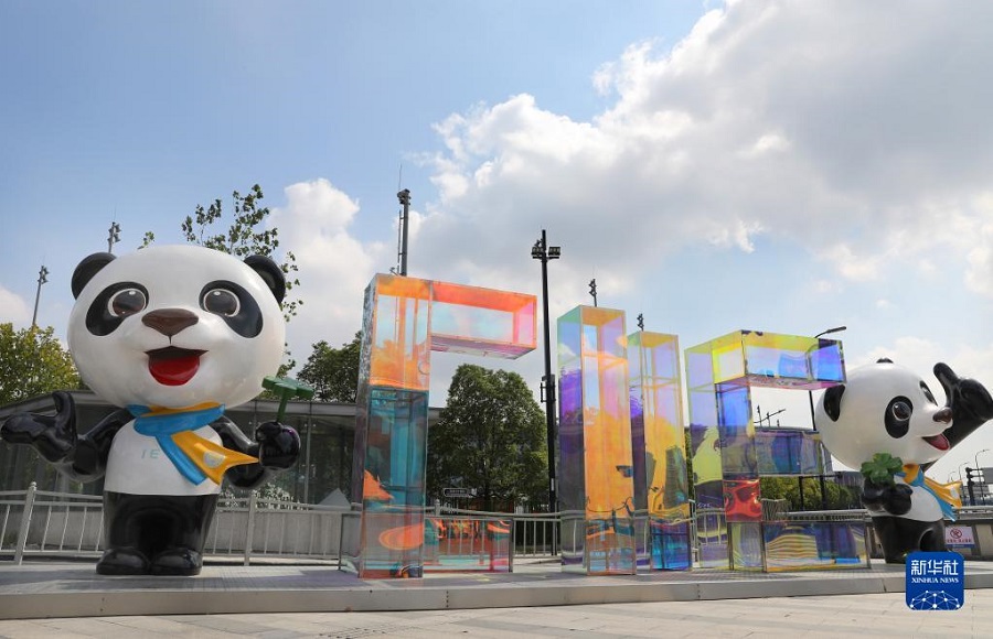 這是國家會展中心(上海)北入口外的進(jìn)博主題裝飾(10月15日攝)。