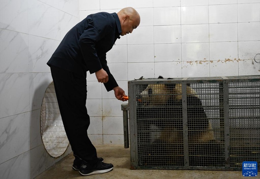 10月18日,在中國大熊貓保護研究中心雅安基地,飼養(yǎng)師董禮用胡蘿卜安撫進入轉運籠的大熊貓“四!。