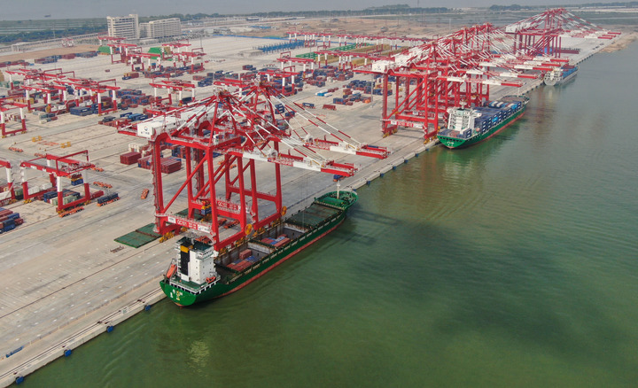這是7月28日拍攝的廣州港南沙港區(qū)四期全自動化碼頭(無人機(jī)照片)。 新華社記者 鄧華攝