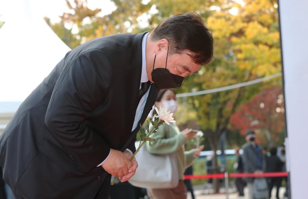 邢海明大使在首爾廣場(chǎng)的香堂吊唁梨泰院踩踏事故遇難者。 圖源:中國(guó)駐韓國(guó)大使館
