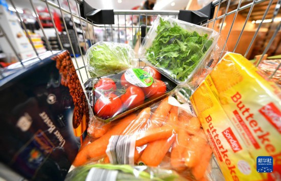 這是11月11日在德國柏林一家超市內(nèi)拍攝的購物車內(nèi)的商品。
