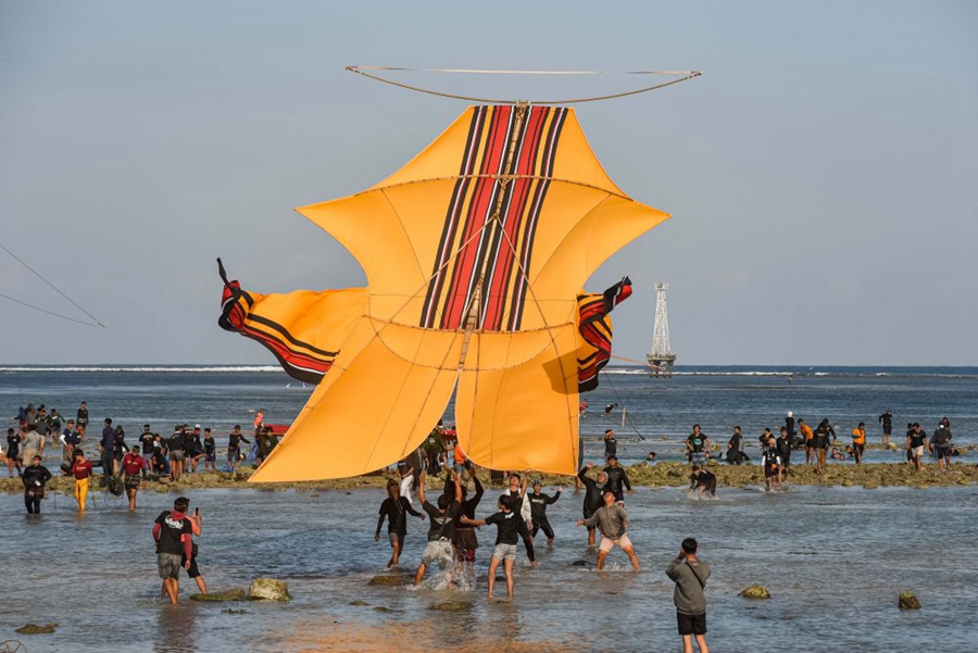 2022年7月31日,人們在印度尼西亞巴厘島舉辦的風(fēng)箏節(jié)上放當(dāng)?shù)貍鹘y(tǒng)風(fēng)格的風(fēng)箏。新華社發(fā)(比興拉辛攝)