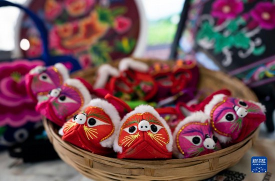 這是11月20日在南博會旅游文化館內(nèi)拍攝的彝繡虎頭鞋。