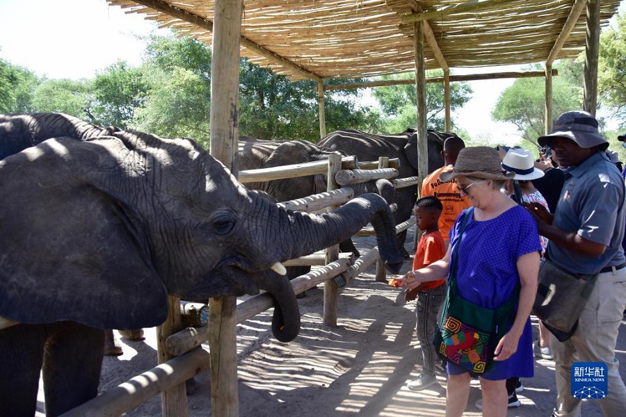 12月26日,在博茨瓦納東北部馬翁的大象孤兒院,游客投喂幼象。