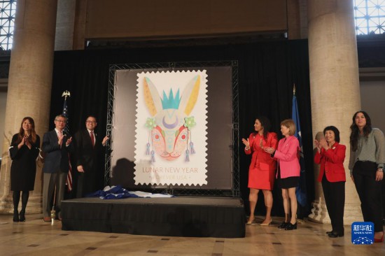 1月12日,美國郵政總局在舊金山亞洲藝術博物館舉行中國農(nóng)歷兔年生肖紀念郵票發(fā)行儀式。
