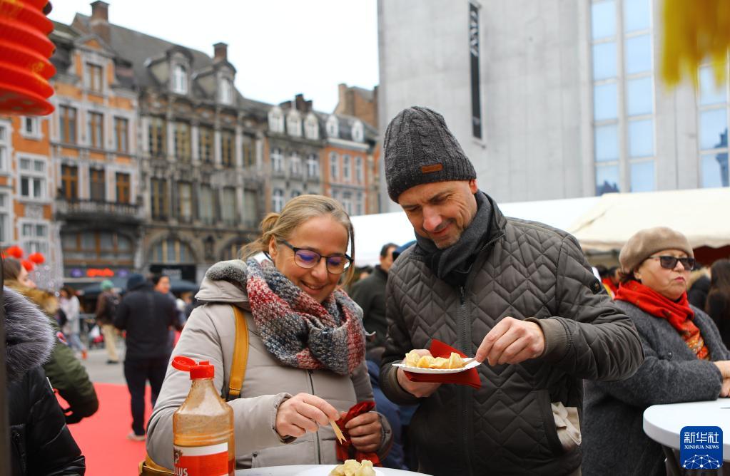 1月28日,人們在比利時(shí)納慕爾品嘗中式小吃。