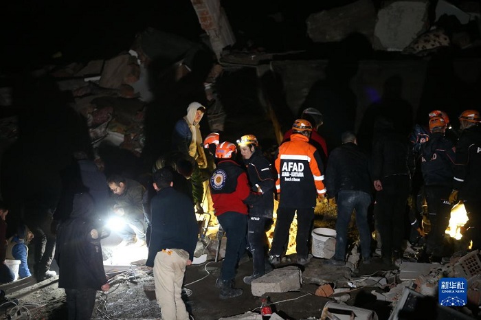 2月6日,救援人員在土耳其南部地震重災(zāi)區(qū)卡赫拉曼馬拉什省帕扎爾哲克倒塌的建筑中搜尋幸存者。新華社發(fā)(穆斯塔法·卡亞攝)
