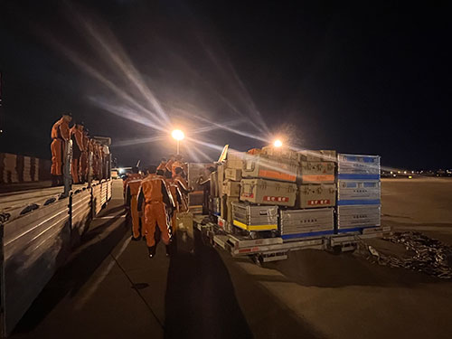 當?shù)貢r間2月8日凌晨4點30分(北京時間9時30分),中國救援隊一行82人經過約10小時的飛行,抵達土耳其阿達納機場。隊長趙明介紹,根據(jù)當?shù)貙嶋H情況,中國救援隊立即開展卸貨轉運工作,盡快做好與我駐土耳其使館、當?shù)卣、?lián)合國有關機構對接,結合目前救援進展情況,接領具體搜救行動任務,并擬派出救援小隊對執(zhí)行任務場地進行實地勘查,同時選擇安全合適的位置搭建營地。