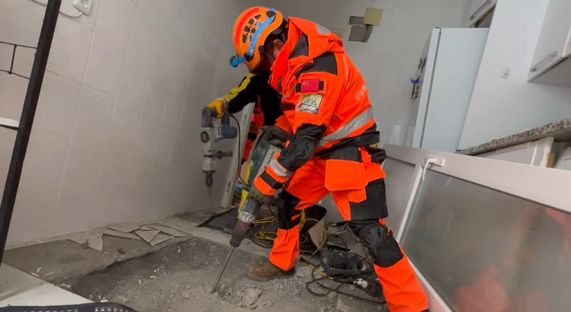 有一處救援點(diǎn)難度很大,是在一處斜樓的樓板里。據(jù)當(dāng)?shù)厝朔从,樓里還有一名15歲的男孩沒被發(fā)現(xiàn)。受條件限制,我們需要輪流作業(yè),用基礎(chǔ)工具在2樓打穿樓板到1樓,才能確認(rèn)有沒有生命跡象。然而,這次的救援結(jié)果依然讓我們感到揪心。