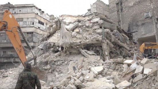 敘利亞北部阿勒頗省是受災(zāi)最嚴(yán)重的省份之一。首府阿勒頗市建筑密集、人口集中,大量建筑物年代久遠(yuǎn),加上在內(nèi)戰(zhàn)中受損,地震中房屋垮塌尤為嚴(yán)重?逅ㄖ,雨后的道路泥濘難行。挖掘機(jī)在廢墟上“轟轟”作業(yè),建筑廢墟龐大、細(xì)碎又層層交疊,鋼筋鐵絲穿插其中,搜救難度很大。