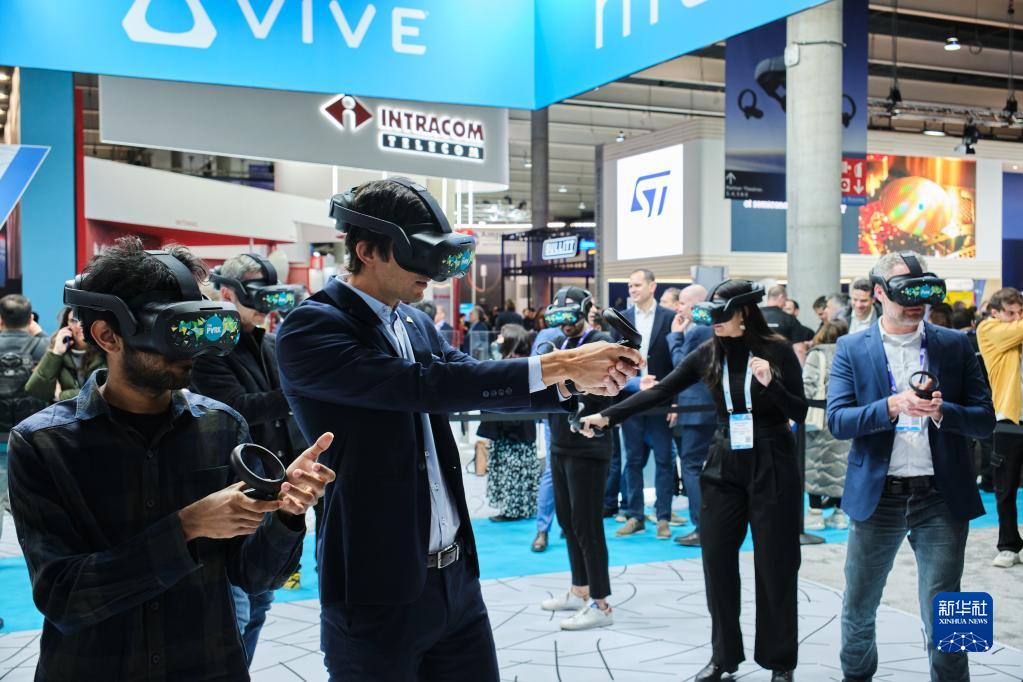 2月28日,參觀者在西班牙巴塞羅那舉行的2023世界移動通信大會上體驗虛擬現(xiàn)實技術。