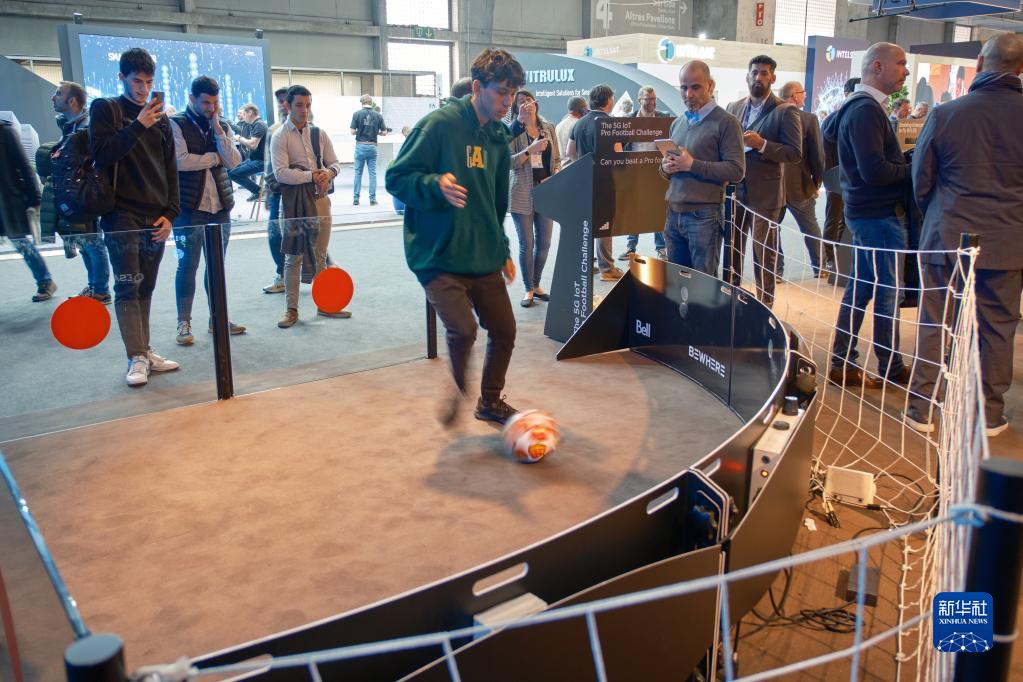 2月28日,一名男子在西班牙巴塞羅那舉行的2023世界移動(dòng)通信大會(huì)上體驗(yàn)智能足球測試設(shè)備。