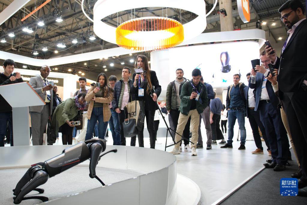 3月1日,在西班牙巴塞羅那,人們?cè)谑澜缫苿?dòng)通信大會(huì)上參觀小米機(jī)器狗Cyberdog。