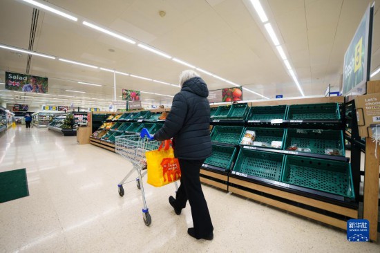 3月2日,在英國(guó)曼徹斯特,一家超市的蔬菜貨架出現(xiàn)缺貨。