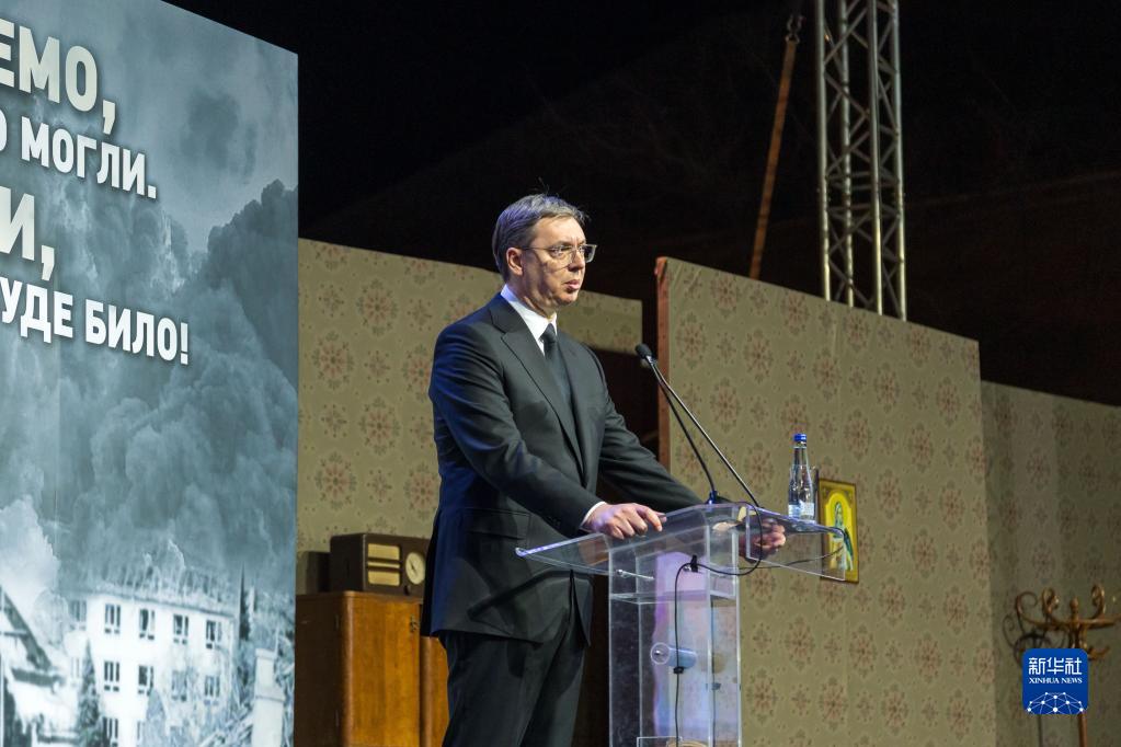 3月24日,在塞爾維亞北部城市松博爾,塞爾維亞總統(tǒng)武契奇在悼念北約轟炸南聯(lián)盟遇難者儀式上致辭。新華社記者石中玉攝