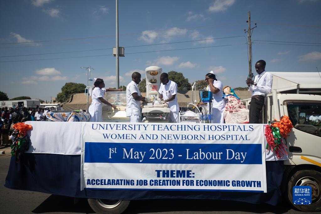 當(dāng)天上午,贊比亞首都盧薩卡舉行游行活動(dòng), 慶!拔逡弧眹H勞動(dòng)節(jié)。