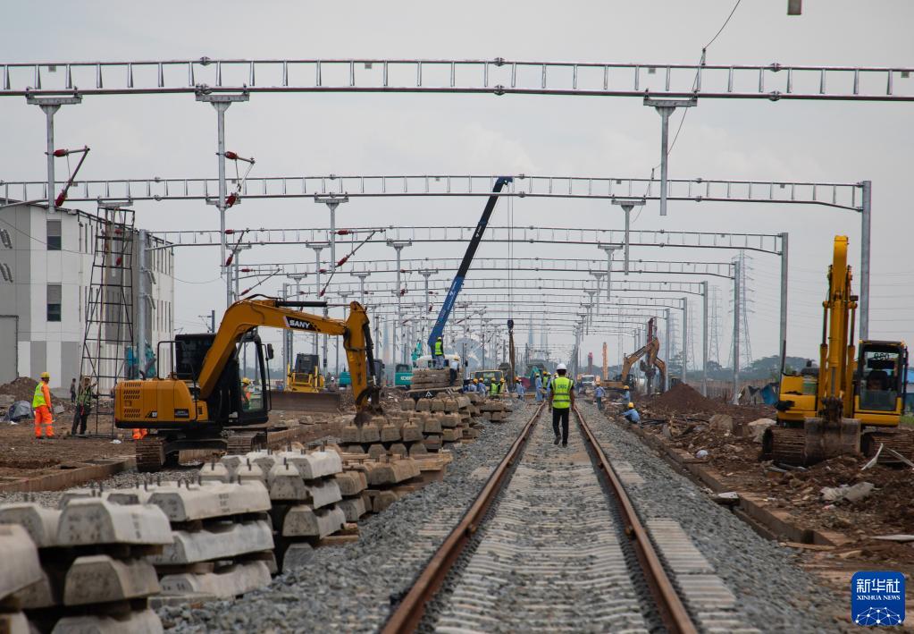 5月1日,在印度尼西亞萬隆,建設者在雅萬高鐵德卡魯爾動車所施工現(xiàn)場作業(yè)。
