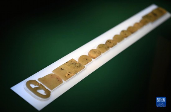 這是在陜西歷史博物館拍攝的骨咄玉帶銙(5月11日攝)!肮沁汀奔寸孢土_,是位于今塔吉克斯坦和阿富汗之間的中亞小國,史籍記載與唐王朝交往密切。
