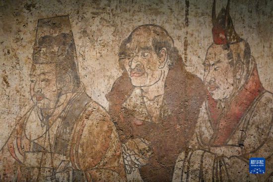 這是在陜西歷史博物館拍攝的唐章懷太子墓《客使圖》(局部)(5月11日攝)!犊褪箞D》描繪的是唐代外交機(jī)構(gòu)鴻臚寺官員接待外國(guó)使節(jié)的場(chǎng)景。