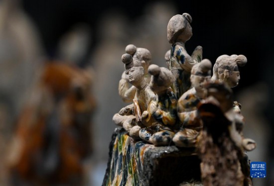 這是在陜西歷史博物館拍攝的唐三彩駱駝?shì)d樂俑(5月11日攝)。這件唐三彩駱駝?shì)d樂俑既是唐代文化藝術(shù)、制作工藝發(fā)達(dá)昌盛的重要物證,也見證了絲綢之路上藝術(shù)的交流與融合。