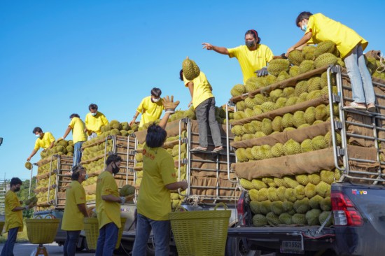 圖為洪九果品泰國工廠的工作人員在裝運(yùn)即將出口的榴蓮。新華社發(fā)