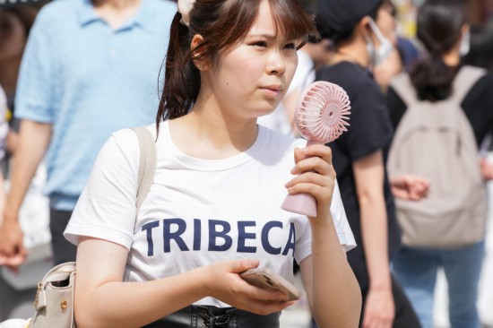 6月29日,一名手持便攜風扇的女子走在日本東京澀谷街頭。新華社記者張笑宇攝