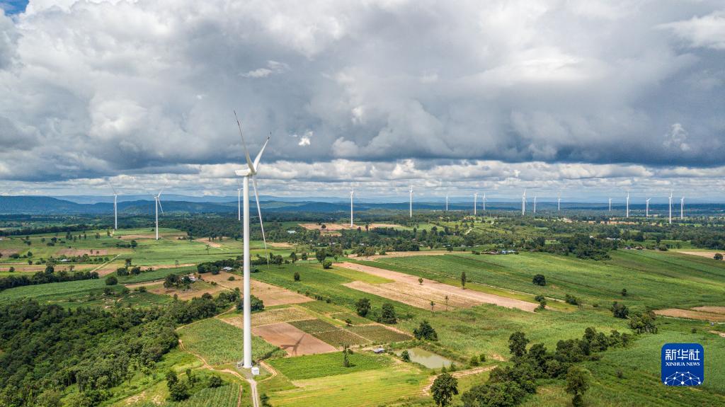 這是10月5日在泰國(guó)猜也蓬府拍攝的由中國(guó)金風(fēng)科技提供的風(fēng)力發(fā)電機(jī)(無(wú)人機(jī)照片)。