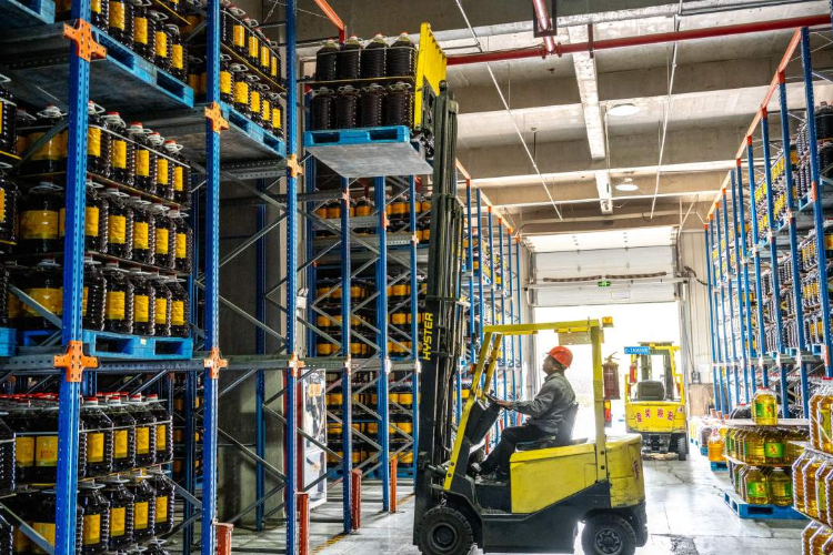 走進(jìn)西安愛(ài)菊糧油工業(yè)集團(tuán),工作人員正駕駛叉車,將食用油運(yùn)輸至倉(cāng)庫(kù)存放?吹綇闹衼喌鹊剡M(jìn)口的商品滿目琳瑯,外媒記者興奮不已。