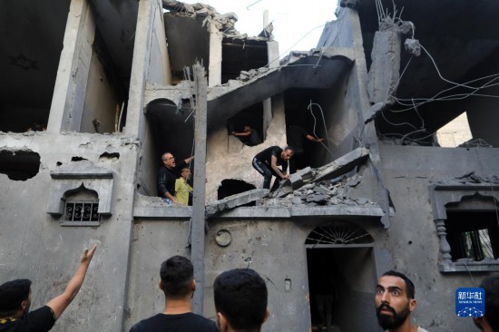10月19日,在加沙地帶南部城市汗尤尼斯,人們?cè)谠庖陨锌找u后的建筑廢墟中救援傷者。