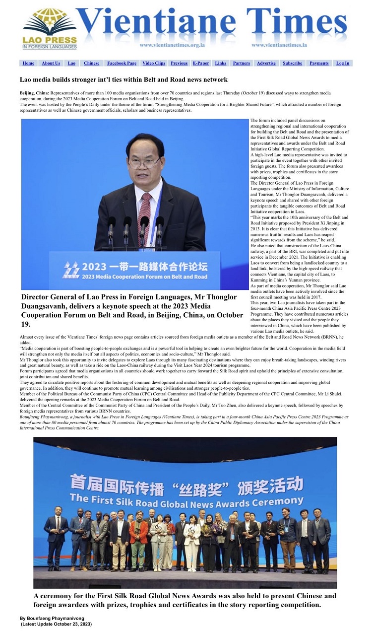 老撾《萬象時報》網(wǎng)站報道2023“一帶一路”媒體合作論壇及國際傳播“絲路獎”頒獎活動