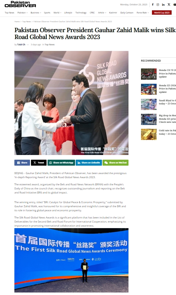 《巴基斯坦觀察家報(bào)》網(wǎng)站報(bào)道首屆國際傳播“絲路獎(jiǎng)”頒獎(jiǎng)活動(dòng)