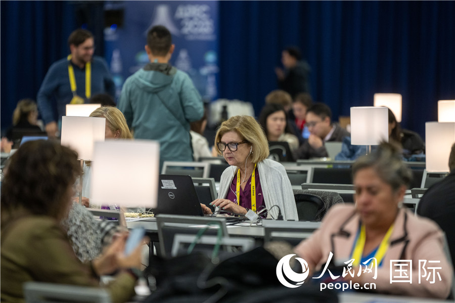 當(dāng)?shù)貢r(shí)間11月16日,美國舊金山,在APEC國際媒體中心,媒體記者忙碌工作。