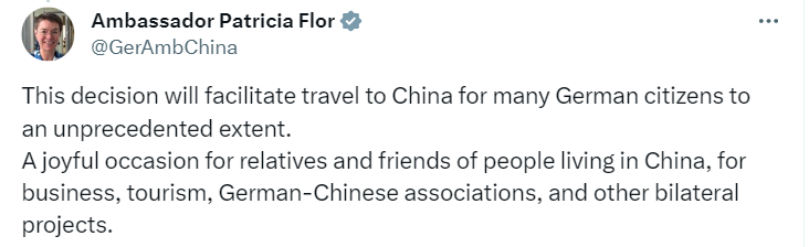 德國(guó)駐華大使傅融(Patricia Flor)在社交媒體平臺(tái)寫(xiě)道:“這一決定將在前所未有的程度上為德國(guó)公民前往中國(guó)帶來(lái)便利。無(wú)論是在華的商務(wù)人士、旅游人士、德中協(xié)會(huì)以及從事其他雙邊項(xiàng)目的朋友,這都是一個(gè)歡樂(lè)時(shí)刻!