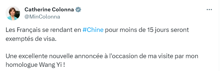 法國(guó)外長(zhǎng)科隆納也表示:“我的同事王毅在我訪(fǎng)問(wèn)之際宣布了一個(gè)很棒的消息!前往中國(guó)停留不超過(guò)15天的法國(guó)人將免簽!