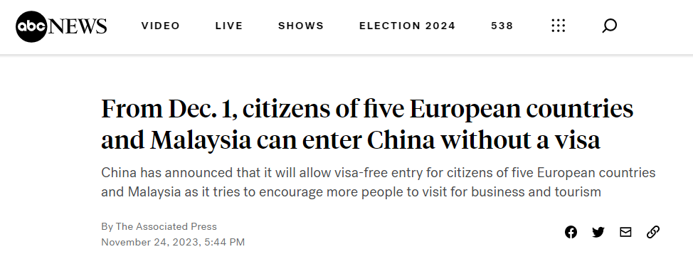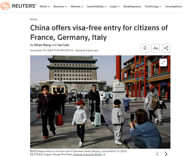 路透社報(bào)道稱(chēng),中國(guó)外交部宣布,2023年12月1日至2024年11月30日期間,上述國(guó)家持普通護(hù)照人員來(lái)華經(jīng)商、旅游觀光、探親訪(fǎng)友和過(guò)境不超過(guò)15天,可免辦簽證入境。