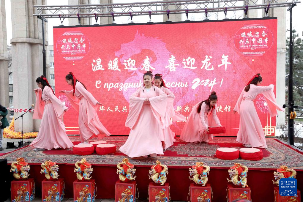 1月30日,演員在吉爾吉斯斯坦首都比什凱克國立大學舉辦的“溫暖迎春·喜迎龍年”新春廟會上進行舞蹈表演。