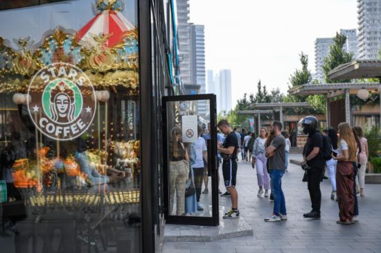 2022年8月22日,人們在俄羅斯莫斯科排隊等待進入一家“星咖啡”門店。新華社發(fā)(亞歷山大攝)